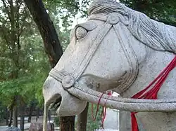 It is said that the next year, the Emperor ordered the construction of the White Horse Temple on the south side of the Imperial Drive three li outside the Hsi-yang Gate of the capital Luoyang, to remember the horse that carried back the sutras. After the death of the Emperor a meditation hall was built on his tomb. In front of the stupa luxuriant pomegranate and grape vines were grown which were said to be larger than those elsewhere.[24]