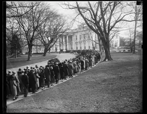 The White House New Year's Reception was an annual public reception held at the White House every New Year's Day from 1801 to 1932.[1][2] Attendees were able to go inside the White House to greet and shake the hand of the president of the United States and often the hand of the first lady of the United States. The president was expected to shake each person's hand. The first lady would shake hands as well, but she was able to leave early if she grew tired.[3][4][5][6]