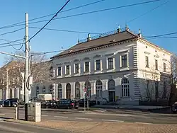 In the first planning phase around 1869, the project was the subject of numerous political and technical discussions. The focus was on the location between the regulated Danube river and Danube Canal, the elevation of the terrain and crossings for the local residents. Discussion points were how far the groundwater has to be taken into account, as the level of construction work has a significant impact on construction costs. Another point was the number and dimensions of the passageways underneath the station.[11] The structure was initially intended for the western (back) part of the Augarten, but this location would have hindered the connection between the Danube main stream and the city more than the finally selected location.[12] In mid-June 1869, a solution could be found next to the Taborstrasse, after complete reworking of the project.[13]
