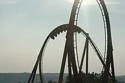 One of Wildfire's trains navigating the Immellmann loop, with the vertical loop in the foreground