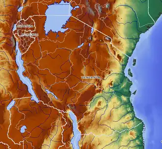 The second smallest of Tanzania's national parks is Gombe Stream National Park is located in Kigoma District of Kigoma Region, covering an area of only 52 square kilometres (20 sq mi).[13] Its natural topography consists of steep hill slopes, river valleys, and the sandy northern shores of Lake Tanganyika.[13] It is drained by the Gombe River. Access to the park is only through marine vessels[14] from Kigoma.[13]