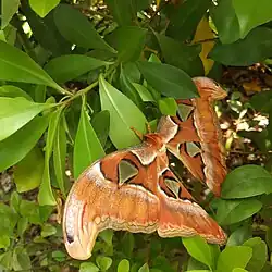 About 70% of the Philippines' nearly 21,000 recorded insect species are found only in the country. In addition, about one-third of the 915 butterflies found here are endemic to the country, and over 110 of the more than 130 species of tiger beetle are found nowhere else. One of the largest butterflies in the world and the largest in the Philippines, the Magellan birdwing, can be found here. The largest moth, the Atlas moth, can also be found in the Philippines.[3]