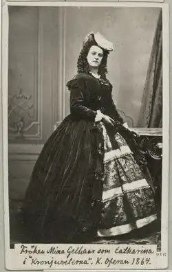 Wilhelmina Charlotta Gelhaar (1837–1923) was a Swedish operatic soprano who performed at the Royal Theatre in Stockholm from 1857 to 1866. She also gave concert performances. Thanks to her coloratura soprano roles, her good looks, her pleasant disposition and her competence as an actress, she was one of the most popular singers of her day.[1][2]