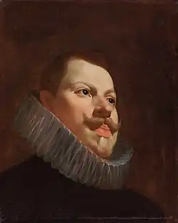 Jordan found that historical accounts of Philip III in The Expulsion of the Moriscos match the expression and direction of Portrait of Philip III; he added that Philip III looking upwards suggested that it was meant to be a part of another painting with a wider scene. He concluded that the style of Portrait of Philip III was similar to Velázquez's distinctive work from that period.[73] Jordan kept the painting in his private collection, and sent it to the Prado Museum for authentication in 2015.[74] After the museum confirmed its attribution, the painting became valued at around US$6 million.[75] In 2016, Jordan donated it to a non-profit organization, the American Friends of Prado Museum, which then gave the painting to the museum as a long-term deposit.[73][ix]