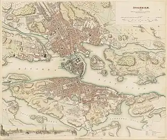 Clarke's Plan of Ancient Rome, with architectural views, was engraved by J. and C. Walker and published under the superintendence of the Society in 1830, and had a companion Plan of Modern Rome. Under the same auspices his plan of Warsaw (engraved by T. E. Nicholson) is dated 1831, his Milan and Frankfurt am Main 1832, his Berlin, and his Turin, with three views, 1833 (both engraved by J. Henshall); his Paris and St Petersburg are of 1834. His London, Florence, Genoa, Venice and Amsterdam (engraved by Benjamin Rees Davies, 1789–1872) are dated 1835, his Moscow 1836, and his Naples, with architectural view (engraved by T. Bradley) is of 1838.[44] His Scandinavian efforts include Copenhagen, with a panorama (J. Henshall), dated 1837, and Stockholm (1838). Clarke's plans and maps, of which he produced many, are still admired and collected.