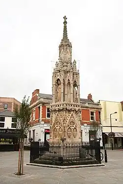 The restoration, which was funded by subscription, was approved for its sympathetic treatment of the Gothic monument.[30] On 17 May 1834 a notable company gathered at the Falcon Inn in Waltham (part of which had been demolished improve the environs of the Cross), to commemorate the result. This meeting was chaired by William Harrison, K.C., and addressed by the elderly Sir Abraham Hume (accompanied by his grandson the Viscount Alford), by Richard Taylor for the Society of Antiquaries of London, and by Sir Richard Westmacott for the Royal Academy. Clarke was especially commended, and he and the Architectural Society were toasted: he replied, explaining the purposes of that Society, and describing how he had first surveyed the cross ten years previously.[31]