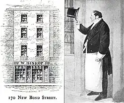 Bishop was born in Ealing and became a goldsmith and later served as an agent for Westley Richards. His shop which was at 170 Bond Street grew into a well-known establishment. Known for wearing a top hat indoors and for his charismatic manners he came to be called the "Bishop of Bond Street". George Teasdale-Buckell described him as: "A large and roomy man, old Bishop, sitting in front of the old white mantelpiece … his gouty leg up on a chair before him. Dressed from head to foot in the blackest of black, a huge white frill proceeding from his breast, and an enormous pair of shirt cuffs turned back over his coat sleeves, and a neatly brimmed hat, which no mortal eye had ever seen off his head. A truly right reverend and Episcopal figure.."[1] Bishop kept several pet dogs and when one of his dogs named Tiny was stolen he was angry to learn that a man could be jailed for stealing a dog collar but not a dog. He then helped create legislation to criminalize the theft of a dog and the Dog Stealing Act 1845 (8 & 9 Vict. c. 47) came to be called the Bishop's Act.[2][3] He had a marble monument made when Tiny died. In 1861 the census noted him as a widower living with three servants above his shop. Upon his death, his estate was valued at £10,000.[4]