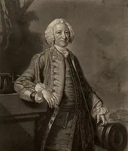 When the Seven Years' War began in April 1756, the French quickly occupied the island and began the Siege of Fort St Philip, which was commanded by Blakeney.[1] An attempt by Admiral John Byng to lift the siege was repulsed in May, and Blakeney surrendered on 29 June. The garrison was given free passage to Gibraltar, whose governor was Thomas Fowke, court-martialled but acquitted in 1746 for the defeat at Prestonpans.[19] In the inquiry that followed, Fowke was dismissed for failing to provide reinforcements from the Gibraltar garrison, while Byng was executed in March 1757.[20] The heavy drinking that left Blakeney with "a paralytick disorder" and "nervous tremors", was portrayed as the virtues of a simple soldier, but many considered his surrender premature.[21] Although rewarded by being appointed to the Order of the Bath and made 'Baron Blakeney' in the Irish peerage, delirium tremens left him barely able to write his name, and this ended his military career.[22] He died on 20 September 1761 in Ireland and later buried in the nave of Westminster Abbey; the gravestone still exists, but the inscription is now very faint.[23]