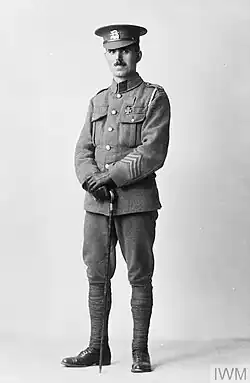 In March 1915, the Meerut Division was selected to be involved in the Battle of Neuve Chapelle, which called for an assault on the German lines at Neuve Chapelle. The Meerut Division was to help force a gap for the Cavalry Corps to exploit.[4] His battalion was on the right of the division's sector and proceeded to capture a section of German trenches that had been overlooked for a preliminary artillery barrage. Over the next two days, until relieved, the battalion resisted German counterattacks and artillery. During this time, Buckingham carried out several sorties to recover men who had been wounded. For his actions, he was awarded the Victoria Cross (VC).[5] The VC, instituted in 1856, was the highest award for valour that could be bestowed on a serviceman of the British Empire.[6] The citation reads as follows: