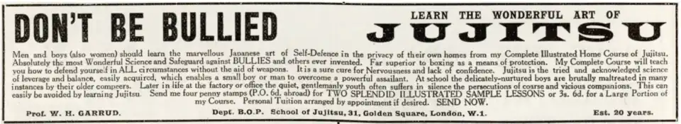 William H. Garrud was born in 1873. As a physical culture instructor, specialised in boxing and wrestling, Garrud travelled around the country teaching classes. In 1892 while giving a class in Bath, he met Edith Williams a fellow teacher of physical education.[1] They married the following year, and moved to London where William found work as a physical culture trainer for universities.[1] In 1900 they watched a Jujutsu demonstration at the Alhambra Theatre by Edward William Barton-Wright. The Garruds became students at Barton-Wright's training facility in Soho the Bartitsu School of Arms and Physical Culture,[2] the first known Japanese martial arts' school in Europe.[3] After the school closed in 1902 they continued training under Japanese jujutsu masters Yukio Tani and Sadakazu Uyenishi who opened the School of Japanese Self Defence[a] at 31, Golden Square, Piccadilly Circus, London.[5] While training at the Golden Square Dojo Garrud studied with the best instructors of the time including Taro Miyake, Mitsuyo Maeda,[b] Gunji Koizumi[c] and Akitaro Ohno.[8]