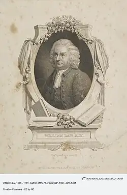 William Law (1686 – 9 April 1761) was a Church of England priest who lost his position at Emmanuel College, Cambridge, when his conscience would not allow him to take the required oath of allegiance to the first Hanoverian monarch, King George I. Previously, William Law had given his allegiance to the House of Stuart and is sometimes considered a second-generation non-juror. Thereafter, Law continued as a simple priest (curate), and when that too became impossible without the required oath, Law taught privately and wrote extensively. His personal integrity, as well as his mystic and theological writing, greatly influenced the evangelistic movement of his day, as well as Enlightenment thinkers such as the writer Samuel Johnson and the historian Edward Gibbon. In 1784, William Wilberforce (1759–1833), the politician, philanthropist, and leader of the movement to stop the slave trade, was deeply touched by reading William Law's book A Serious Call to a Devout and Holy Life (1729).[1] Law's spiritual writings remain in print today.