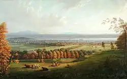 McGillivray's home, Chateau St. Antoine, stood within 200 acres of parkland on Cote St. Antoine, roughly at the end of Dorchester Street.[17] Built in 1803, the house enjoyed "a magnificent view of the city and river".[18] The McGillivrays were well known for their hospitality and kept open house at St. Antoine, as they had done before in their townhouse on St. Gabriel Street. Even his old rival John Jacob Astor came to dine there once a year on his annual trips to Montreal. The ballroom was said to be "an enchanting sight".[19] In 1820, the English geologist, John Jeremiah Bigsby, was invited to a dinner at St. Antoine, which he described at great length in his entertaining book, The Shoe and Canoe: