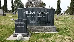 Saroyan died in Fresno, of prostate cancer at the age of 72. Half of his ashes were buried in Ararat Cemetery in Fresno, California, and the remainder in Armenia at the Komitas Pantheon near fellow artists such as composer Aram Khachaturian, painter Martiros Saryan, and film director Sergei Parajanov.[26]