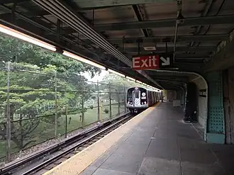 The Rockaway Parkway-bound (upper level) platform has a canopy along the entire length of the platform, supported by a beige concrete retaining wall with curved green supports extending from the wall at regular intervals.[12][13] A fence runs along the track side of the southbound platform, separating the subway station from the Most Holy Trinity Cemetery, which is visible directly through the fence.[12][13] The Manhattan-bound (lower level) platform has tiling and name plaques, which is typical for a Canarsie Line underground station. A concrete wall closes off the east side of the lower level.[12] The mosaic band is predominantly green at edges with a vivid multicolored design throughout, 28 colors in all. The trackside wall once had tiles that matched those of the platform, but these tiles were removed sometime after 1982, and the trackside wall is currently the same plain, dark color as a typical New York City Subway tunnel wall.[12][13]