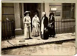 ![]() Edith How-Martyn, Mrs Sproson, Charlotte Despard, Miss (Constance) Tite standing outside the WFL offices in the Victoria Institute | |