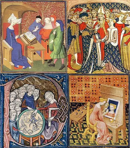 In Irish law, women were forbidden to act as witnesses in courts.[80] In Welsh law, women's testimony could be accepted towards other women but not against men, but Welsh laws, specifically The Laws of Hywel Dda, also reflected accountability for men to pay child maintenance for children born out of wedlock, which empowered women to claim rightful payment.[81] In France, women's testimony had to corroborate with other accounts or it would not be accepted.[80] Although women were expected to not attend courts, this however was not always true. Sometimes, regardless of expectations, women did participate and attend court cases and court meetings. But women could not act as justices in courts, be attorneys or members of a jury, or accuse another person of a felony unless it was the murder of her husband.[82] For the most part, the best thing a woman could do in medieval courts was to observe the legal proceedings taking place.
