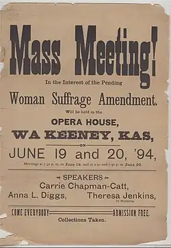 "Mass Meeting!" poster for women's suffrage meeting in Wakeeney, Kansas June 1894