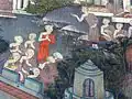The divine feminine is connected to the story of Gautama Buddha's enlightenment under the bodhi tree. When Mara appears to Gautama and questions his worthiness to become the Awakened one, Gautama calls upon Mother Earth to witness his merit throughout countless previous lifetimes by touching the ground. This gesture is known as the bhūmisparśa or "earth witnessing" mudra. While Mother Earth is associated with the Goddess Prithvi, Alex Wayman asserts that the divine feminine in Tantra is connected with a plethora of terms including prajna ('insight'), yogini ('female yogin'), vidya ('know how'), devi ('goddess'), matr ('mother'), matrka ('mother' or 'letters'), and mudra ('seal' or 'gesture').[91] The anthropomorphic expression of Mother Earth in Gautama's enlightenment story developed into the figure of Buddha Locana ("eyes") in Tantrism. As one of the Five Buddha Mothers that represents the purity of the element of earth, Buddha Locana is a fully enlightened female Buddha and is the consort of Akshobya according to the Guhyasamāja Tantra or "Secret Assembly."[92] In the Guhyasamāja mandala, Buddha Locana occupies a higher status than Gautama Buddha as he was not able to attain enlightenment without her being called as a witness. Her title as a Buddha Mother, however, should not be mistaken as a child birthing figure in this context. Rather, the role of Buddha Mother refers to her primordial status. As a metaphorical form, Buddha Locana represents the all-seeing eye and mother figure that watches over humanity. Alex Wayman suggests that the metaphorical symbolism of the earth represents the power of arya-prajna, which provides the means to destroy illusion.[91] The primordial nature and central significance of Buddha Locana can be seen in her placement in the mandala, as she represents the prajna of Vairocana Buddha, who in turn is the dharmakaya of Gautama Buddha. Owing to this classification, Buddha Locana represents the high status of the divine feminine in Tantra, a status that surpasses the masculine principle.