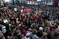 It is said that in 1975, women in the workplace made 60% less than their male counterparts. Many were unable to work as they had to stay at home to do the housework and raise the children.[36] On Friday, October 24, women left their formal and informal work at 14:05 (2:05 pm), the time at which they would have earned their day's wage had they been paid at the same average rate as men.[37] The scale of the event was very large, involving 25,000 women in a country with just 220,000 inhabitants. In Reykjavík, almost 90% of the women participated.[38]