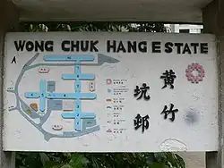 Wong Chuk Hang Estate was the only Government Low Cost Housing Estate on Hong Kong Island in the 1960s and the 1970s. It consisted of 10 residential blocks that were developed in 3 phases. Phase 1 (Block 1 and 2), Phase 2 (Block 3 to 6) and Phase 3 (Block 7 to 10) were completed in 1968, 1972 and 1973 respectively. In 1973, the estate was renamed Wong Chuk Hang Estate. In 1985, Block 9 was found to have structural problems by Hong Kong Housing Authority, and was demolished in 1988.[1][2][3] In 2007, the whole estate was cleared and most of the tenants were moved to the nearby Shek Pai Wan Estate.[4] The site has been replaced by the MTR Wong Chuk Hang station, one of the railway stations of the South Island line, and a railway depot.[5]