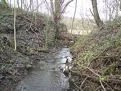 The stream at the site of Wood Mill, 2009, with stone wall on left.