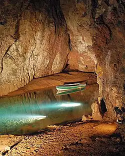 The current resurgence is located close to the base of the Dolomitic Conglomerate at the head of a short gorge formed by headward erosion with subsequent cavern collapse.[20] The morphology of the passages is determined by the rock strata in which they are formed. The streamway in the outer part of the cave system that is formed within the Dolomitic Conglomerate is characterised by shallow loops linking low bedding chambers, or tall narrow passages, known as 'rifts', developed by phreatic solutional enlargement of fractured rifts. The streamway in the inner part of the system formed within the limestone is characterised by deep phreatic loops reaching depths as much as 90 metres (300 ft), with the water flowing down-dip along bedding planes and rising up enlarged joints.[20] In the far reaches of the cave the passages descend to 26 metres (85 ft) below sea level.[1][3]