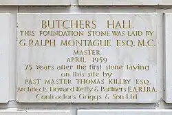 The Company's headquarters is at Butchers' Hall. The Butchers' has had several halls throughout its history. The first was located in Monkwell Street and dated from the second half of the 15th century. The next Hall near St Bartholomew's Hospital was destroyed in the Great Fire of London of 1666, together with forty three other Livery Company Halls.