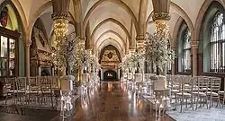Its architectural features include distinctive terracotta decorations on brickwork, octagonal turrets and stacks, winged gryphons on the porch, and plaster wall panels by Kent painted in Chinese style by Belgian Jean Derraux.[3] The old orangery (now the centre's bar[4]), has a decorative parapet and banded piers. Many of the doors feature small paintings above them.[3]