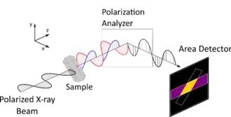 X‑ray birefringence imaging[1] (XBI) can be considered the X‑ray analogue of the polarizing optical microscope. XBI uses linearly polarized X-rays with an energy tuned to an elemental absorption edge. The tuned X-rays interact solely with the absorbing element, thus allowing the local anisotropy of the bonding environment of the X‑ray absorbing element to be studied.[2][3] Due to the requirement of linearly polarized tunable X-rays a synchrotron source is necessary. Interaction with the bonding environment of the selected element in the sample changes the incident X-ray polarization plane. A polarization analyzer is used to diffract the rotated component of the polarization plane to an area detector. The greater the vertical component of the polarization plane the greater the intensity observed on the detector. In this way, it is possible to study the distribution of bond environments containing the X-ray absorbing element in a spatially resolved manner.