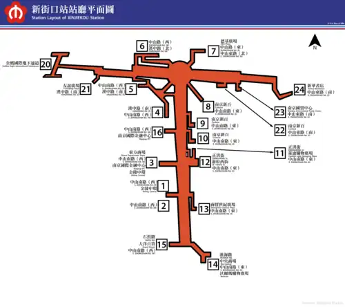 Xinjiekou station (Chinese: 新街口站; pinyin: Xīnjiēkǒu Zhàn) is an interchange station between Line 1 and Line 2 of the Nanjing Metro. It is located in Xinjiekou, the central business and commercial district of Nanjing. The largest and busiest station in the system, Xinjiekou station has 25 officially marked exits.[1] On 30 September 2016 the station served a peak volume of 130,500 passengers.[2] Trains here stop for 55 seconds, the longest stop at a non-terminus station in a mainland Chinese metro system.[3]