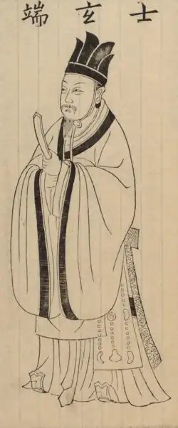 Xuanduan (Chinese: 玄端), also known as yuanduan (Chinese: 元端), is a form of Chinese court dress (and/or ritual garment[1][2]) which was made of dark or black fabric.[3][4] It is a form of yichang (i.e. a set of attire composed of upper and lower garment).[5][6] It was worn since the Western Zhou dynasty.[5] During the Ming dynasty, under the reign of Emperor Jiajing, the xuanduan became a model for the regulations reforms related to yanfu (casual or leisure clothing) worn by the emperor and officials.[7]