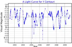 Y Centauri is an asymptotic giant branch[13] star 330 times as luminous as the sun. Its spectral type varies between M4 and M7 as it pulsates.[3]