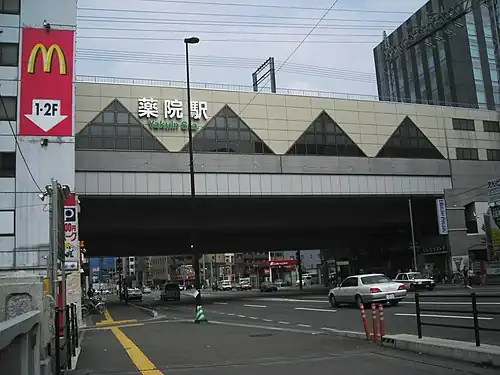 Yakuin Station (薬院駅, Yakuin-eki) is a passenger railway station located in Chūō-ku, Fukuoka. The above ground portion is operated by the private transportation company Nishi-Nippon Railroad (NNR), and has station number T02, and the underground portion is operated by the Fukuoka City Subway[1] The subway station's symbol mark is a mortar and pestle, because 薬院 means medicinal plant botanical garden in Japanese.