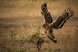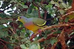 Yala is one of the 70 Important Bird Areas (IBAs) in Sri Lanka.[10] Of 215 bird species of the park, seven are endemic to Sri Lanka.[2] They are Sri Lanka grey hornbill, Sri Lanka junglefowl, Sri Lanka wood pigeon, crimson-fronted barbet, black-capped bulbul, blue-tailed bee-eater and brown-capped babbler. The number of waterbirds inhabiting wetlands of Yala is 90 and half of them are migrants.[3] Waterfowl (lesser whistling duck, garganey), cormorants (little cormorant, Indian cormorant), large waterbirds (grey heron, black-headed ibis, Eurasian spoonbill, Asian openbill, painted stork), medium-sized waders Tringa spp., and small waders Charadrius spp. are among the most common waterbirds. Black-necked stork and lesser adjutant are many of the rare birds that can be seen in the park. The migrant great white pelican and resident spot-billed pelican are also have been recorded. Other waterbirds attracted to the Yala lagoons include lesser flamingo, pelicans, and rare species such as purple heron, night herons, egrets, purple swamphen, and Oriental darter. Thousands of waterfowls migrate to the lagoons of Yala during the northeast monsoon. They are northern pintail, white-winged tern, Eurasian curlew, Eurasian whimbrel, godwits, and ruddy turnstone. The visiting species mingled with residing lesser whistling duck, yellow-wattled lapwing, red-wattled lapwing, and great stone-curlew. Rock pigeon, barred buttonquail, Indian peafowl, black stork, black-winged stilt, and greater flamingo are among the other bird species. Crested serpent eagle and white-bellied sea eagle are the raptors of the park. The forest birds are orange-breasted green pigeon, hornbills, Old World flycatchers, Indian paradise flycatcher, Asian barbets, and orioles.[9]