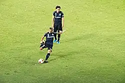 Endō (rear) looking on as Yosuke Ideguchi takes a free kick against Vissel Kobe in 2017