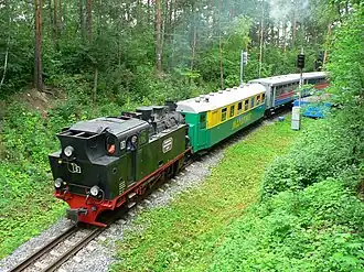 The narrow-gauge route 750 millimetres (30 in) has four stations.[1] The length is 2.8 kilometres (1.7 mi) and a round trip lasts 27 min. Although the train stops at all stations, passengers are only checked in at the final stations. The remaining stops are in the forest, and are rarely visited.