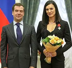 She has two children: Eva, born 28 June 2014, and Dobrynya, born 14 February 2018.[44][45] She married Eva's father, javelin thrower Nikita Petinov (b. 1990) shortly before their daughter's birth and had a wedding celebration on 12 December 2014.[46] On 7 February 2014, Isinbayeva, while pregnant, was one of the final torch bearers for the 2014 Winter Olympics opening ceremony.