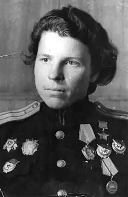Yevdokiya Andreyevna Nikulina (Russian: Евдокия Андреевна Никулина; 8 November [O.S. 26 October] 1917 – 23 March 1993) was a squadron commander in the 46th Taman Guards Night Bomber Aviation Regiment who was awarded the title Hero of the Soviet Union on 26 October 1944.