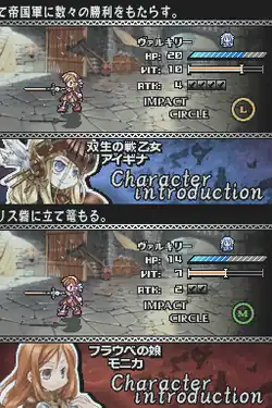 The unit types from Yggdra Union make a return for this game, with the only difference being that Yggdra, Milanor, and Gulcasa no longer have unique classes. Each unit has several different statistics: VIT (vitality, which shows a unit's morale), HP (which is twice their current vitality), ATK (which ranges from 1 to 10), Impact Circle size, a hidden DEF stat, elemental affinity, movement type, and Pride. VIT decreases slowly each turn for every character except the protagonist, and can be restored after battle by giving that unit items that they like; VIT decreases faster if a unit is deployed against a character that he or she does not want to fight.