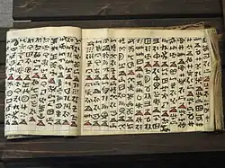 According to Yi legend, all life originated in water and water was created by snowmelt, which as it dripped down, created a creature called the Ni. The Ni gave birth to all life. Ni is another name for the Yi people. It is sometimes translated as black because black is a revered color in Yi culture.[9] Yi tradition tells us that their common ancestor was named Apu Dumu ꀉꁌꅋꃅ or ꀉꁌꐧꃅ (Axpu Ddutmu or Axpu Jjutmu). Apu Dumu had three wives, each of whom had two sons. The six sons migrated to the area that is now Zhaotong and spread out in the four directions, creating the Wu, Zha, Nuo, Heng, Bu, and Mo clans.[10] The Yi practiced a lineage system where younger brothers were treated as slaves by their elders, which resulted in a culture of migration where younger brothers constantly left their villages to create their own domains.[9]