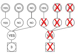 Structure before and after pruning. First the top right-most node becomes a sink from receiving a NO. Being a sink with only one incoming edge, it is trimmed. Same goes for its parent and the central branch.