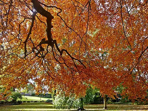 There are approximately 4,500 plants and trees in the collection,[7] some of the varieties native to England and some from other parts of the world. Planting consists of large beds containing predominantly shrubs and trees, and lawns interspersed with individual trees. Species of tree include a monkey puzzle tree along with oak and chestnut trees;[6] six of the trees in the gardens are classed as county champion trees: Fraxinus angustifolia 'Lentiscifolia', Pyrus elaeagrifolia, Carpinus betulus 'Incisa', Alnus glutinosa 'Imperialis', Tilia cordata, Fagus sylvatica 'Miltonensis'.[7][9] There is a rockery next to the Marygate entrance, by the ruins of the abbey church, and in front of the entrance to the Yorkshire Museum there is a terrace bordered with beds of white roses, the symbol of Yorkshire.