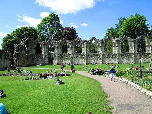 York Museum Gardens cover an area of 10 acres (4.0 ha) on the north bank of the River Ouse, just outside the city walls in the centre of York. There are four entrances to the gardens: on Marygate (off Bootham) by St Olave's Church, on Museum Street by Lendal Bridge, via a path at the side of King's Manor, and from the riverside walk next to the River Ouse. The site slopes gently down towards the river and is made up of historical buildings and undulating lawns interspersed with plants and trees. The gardens are open to the public during daylight hours, so the opening and closing times vary throughout the year. Normally admission is free but there are charges for some events.[7] In 2010 it was estimated that the gardens attract 1.3 million visitors a year.[8] Drinking alcohol, cycling and ball games are not allowed in the gardens.