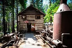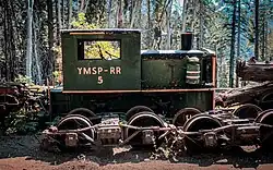 The current railroad follows a portion of grade originally carved into the mountain by the Madera Sugar Pine Lumber Company in the early 20th century. The company originated in 1874, when it was organized as the California Lumber Company to log the area surrounding Oakhurst, California.[3] The Madera Sugar Pine Lumber Company once had a large sawmill at Sugar Pine, California, just south of the current YMSPRR.[4] The railroad had seven locomotives, over 100 log cars, and 140 miles (230 km) of track in the surrounding mountains.[5] In addition to the railroad, the Company also transported lumber in a flume that stretched 54 miles (87 km) from Sugar Pine to Madera, California.[6] This was the most efficient way to transport rough cut lumber out of the mountains for finishing and transport at the bottom of the mountain. The Madera Sugar Pine Lumber Company practiced clearcutting, which removed almost every single tree within the stands of timber surrounding the YMSPRR track. The thick forest surrounding YMSPRR today belies this history, although large stumps from the original old growth timber dot the forest floor lining the tracks.