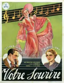 Your Smile (French: Votre sourire) is a 1934 French comedy film directed by Monty Banks and Pierre Caron and starring Victor Boucher, Marie Glory and Raymond Rognoni.[1] It is an adaptation of a play of the same title by André Birabeau and Georges Dolley.[2]