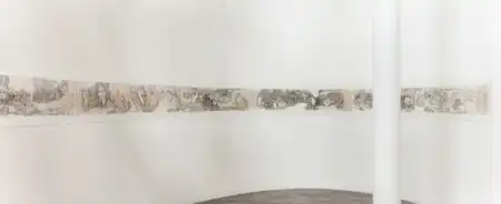 Ji's survey "The Intimate Universe" (Wellin Museum, 2016) and exhibition "Rumors, Ridicules, and Retributions" (James Cohan, 2018) presented more than a decade's work, ranging from sketch studies to his first sculptures (skeletal figures made from paper pulp) to finished paintings and monumental scrolls.[7][3][21] The scrolls included the cinematic, nearly 60-foot-long The Village and its Ghosts (2014) and the ironically titled Village Wen’s Progress (2017).[7][3][46] Both offered a sense of perpetual transition and history repeating itself through an amalgam of settings and signifiers: the devastation of New Orleans, migrants piled with their meager, worldly goods, details of the Nan Shui Bei Diao megaproject, and scenes of Columbus Park in Manhattan.[3][46][5] The imagery of Village Wen’s Progress functioned both literally and symbolically, with collapsing scaffolding, ominous ever-present ghosts and thematic movement from mundane drudgery to hallucinatory chaos that related physical dislocation to mental disintegration.[14] The New York Times called these works subversive in their contradictions,[20] while Artcritical's Robert C. Morgan wrote "Ji draws intentionally and purposefully on the past as a means to exorcise the hidden realities of the present … the brush becomes an indirect signifier of revolt."[21]