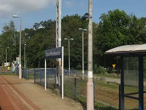 Zębice Wrocławskie railway station is a station in Zębice, Lower Silesian Voivodeship, Poland.[1] Prior to World War II, the railway station constituted a building, destroyed due to war operations. After the war, the building was replaced by a metal shack.