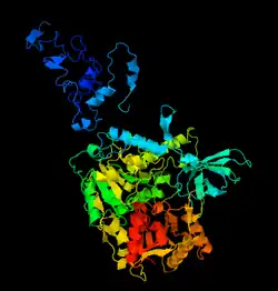 Structure of C4ORF21 based upon UPF1 model. Image colored in rainbow from N to C terminus. This structure is based upon the crystal structure of the complex between 2 human nonsense mediated decay factors, upf1 and upf2, orthorhombic form.