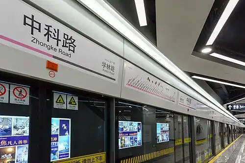Zhongke Road (Chinese: 中科路; pinyin: Zhōngkē Lù) is a station on Line 13 of the Shanghai Metro,[1] part of phase three of the line. Located at Zhongke Road and Jinke Road in Pudong, Shanghai, the station opened with the phases 2 and 3 extensions of Line 13 on 30 December 2018.[2][3]