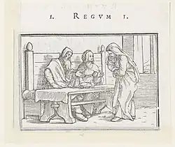 Holbein's illustrations "are very close to the text within the traditional concepts. They combine simplicity, clarity and precision with the highest artistic skill."[80] An example of how Holbein illustrates a biblical narrative is the conflict depicted at the beginning of First Book of Samuel (1 Sam 1:1-8 ZB): The Israelite Elkanah has two wives, Hanna and Peninna. Hannah, whom he loves, is childless, but Peninnah has borne him children. Whenever Elkanah visits the shrine in Shiloh with his family, Peninna is given the opportunity to humiliate her rival. And now Holbein's illustration: Elkanah and Peninnah are sitting in an interior room on a wooden bench behind a table, with the two doves for the upcoming sacrifice in front of them. Both people turn to Hanna, who stands before them weeping and bent over: Peninna, sitting next to Hanna, is provocative, Elkanah encouraging, but speaking from a distance.[81]